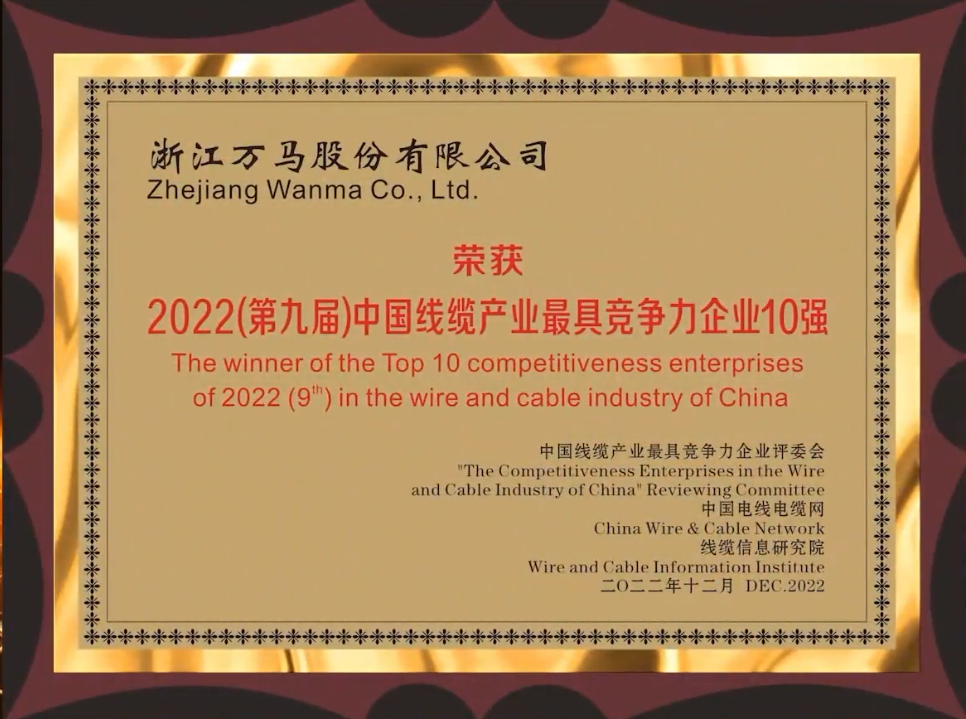 ▲萬(wàn)馬股份“2022年度中國(guó)線纜行業(yè)最具競(jìng)爭(zhēng)力企業(yè)10強(qiáng)”獎(jiǎng)牌