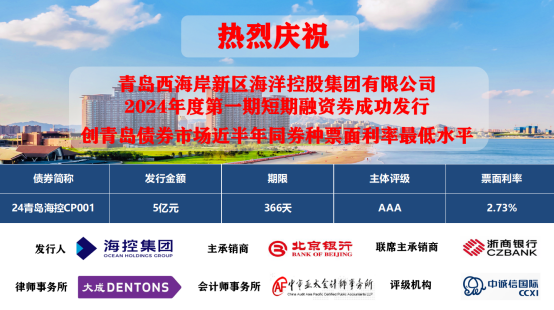 1月19日,海控集團(tuán)成功發(fā)行2024年度第一期短期融資券(24青島海控CP001),募集資金5億元,期限1年,發(fā)行利率為2.73%,認(rèn)購倍數(shù)5.72倍,創(chuàng)青島債券市場近半年同券種票面利率最低水平。